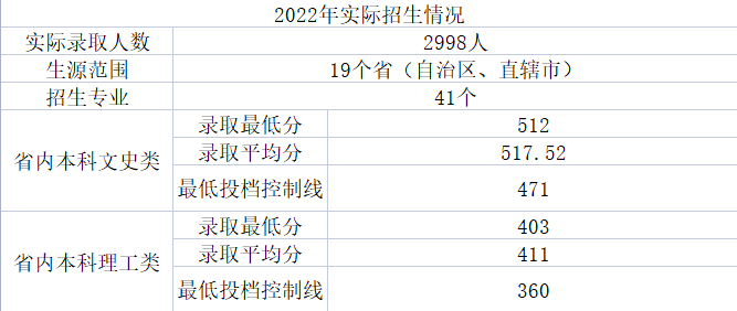 2022年,我校招生實(shí)際錄取2998人,生源范圍覆蓋19個(gè)?。ㄗ灾螀^(qū)、直轄市),招生專業(yè)共41個(gè)。其中:省內(nèi)普通本科文史類錄取最低分512分、平均分517.52分,分別高出貴州省本科最低投檔控制線(471分)41分、46.52分;省內(nèi)普通本科理工類錄取最低分403分、平均分411分,分別高出貴州省本科最低投檔控制線(360分)43分、51分。
