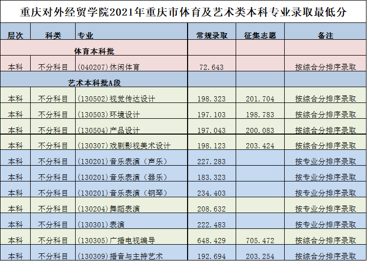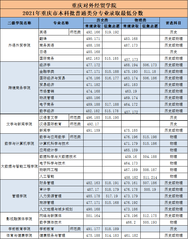 重慶對外經(jīng)貿(mào)學院2021年重慶市本科批普通類分專業(yè)錄取最低分