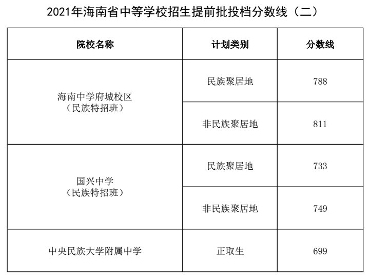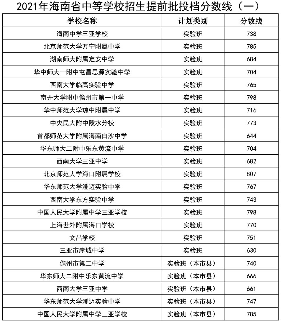 ![]() 2022年海南中考錄取分?jǐn)?shù)線 我省2022年中考評卷工作已經(jīng)結(jié)束,現(xiàn)將成績發(fā)布的有關(guān)事項(xiàng)公告如下: 一、發(fā)布時(shí)間 2022年7月16日上午8:00。 二、查詢方式 考生可通過以下6種渠道查詢: ?。ㄒ唬┖D鲜】荚嚲止俜骄W(wǎng)站查詢 考生可進(jìn)入海南省考試局官網(wǎng)(ea.hainan.gov.cn),點(diǎn)擊“2022年中考成績查詢”,登錄海南省初中學(xué)業(yè)水平考試管理系統(tǒng)查詢(本途徑只提供九年級考生成績查詢)。 ?。ǘ┖D鲜〗逃龔d官方微信公眾號查詢 考生可關(guān)注海南省教育廳官方微信公眾號(可用微信掃描下圖二維碼關(guān)注),點(diǎn)擊主菜單中“中考查分”,輸入準(zhǔn)考證號碼、考生身份證號碼后六位以及界面上的驗(yàn)證碼查詢(本途徑只提供九年級考生成績查詢)。 時(shí)間安排表 2022年中招錄取工作將分提前批、第一批、第二批、第三批四個(gè)批次進(jìn)行。 7月19日下午至21日為提前批錄取時(shí)間; 7月22日下午至23日為第一批A段錄取時(shí)間,7月25日至26日16時(shí)為修改第一批B段志愿時(shí)間,7月27日至29日為第一批B段、自主招生計(jì)劃和指標(biāo)到校生錄取時(shí)間; 7月30日下午至8月1日為第二批錄取時(shí)間; 對于第三批,一般公辦普通高中學(xué)校和民辦普通高中學(xué)校于8月6日下午至7日錄取,8月8日至9日為高校五年一貫制計(jì)劃、中高職“3+2”連讀及中高職“3+2”分段培養(yǎng)試點(diǎn)班錄取時(shí)間。 海南2021年中考分?jǐn)?shù)線 1、海南省中等學(xué)校招生提前批投檔分?jǐn)?shù)線(一)